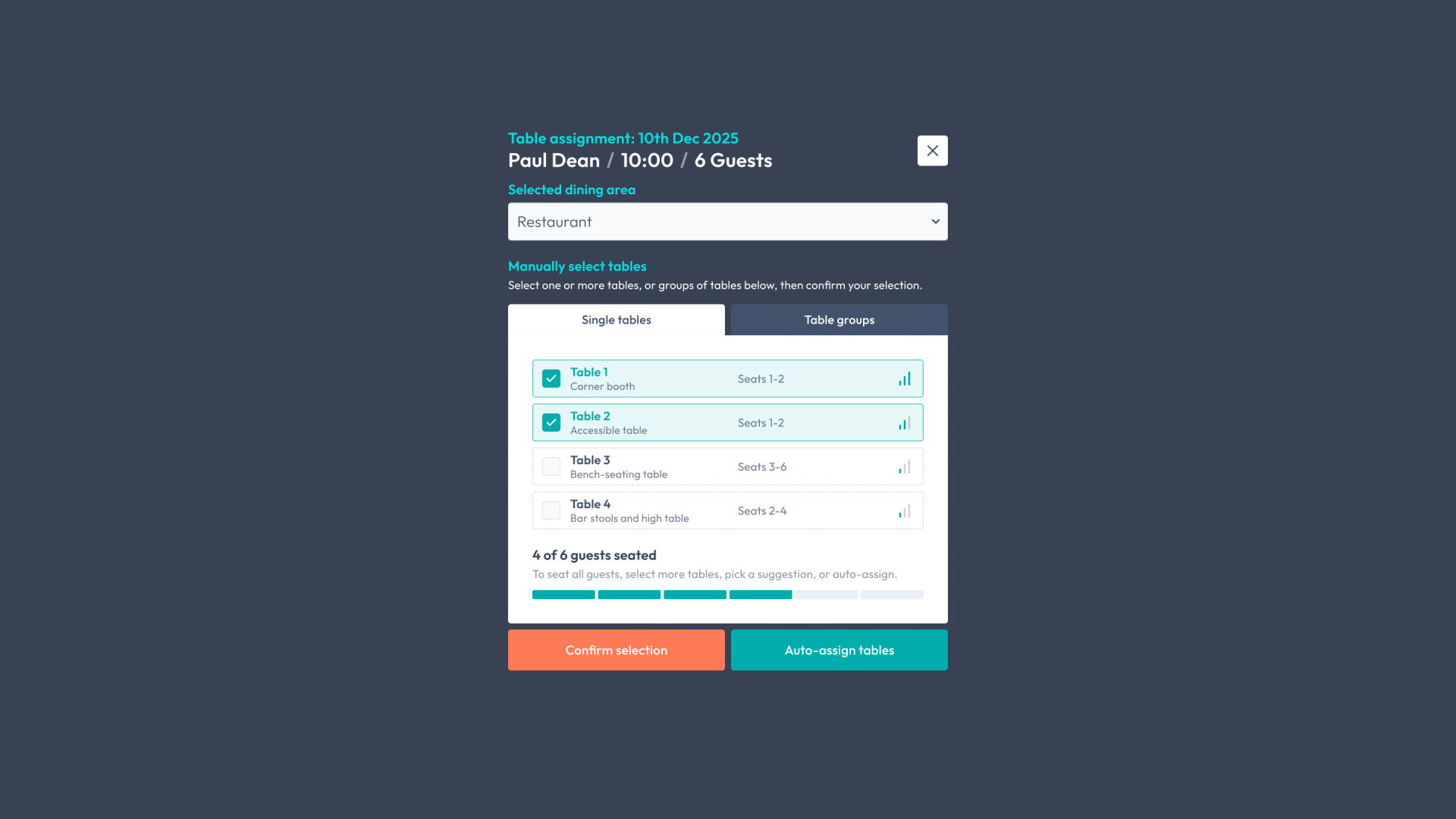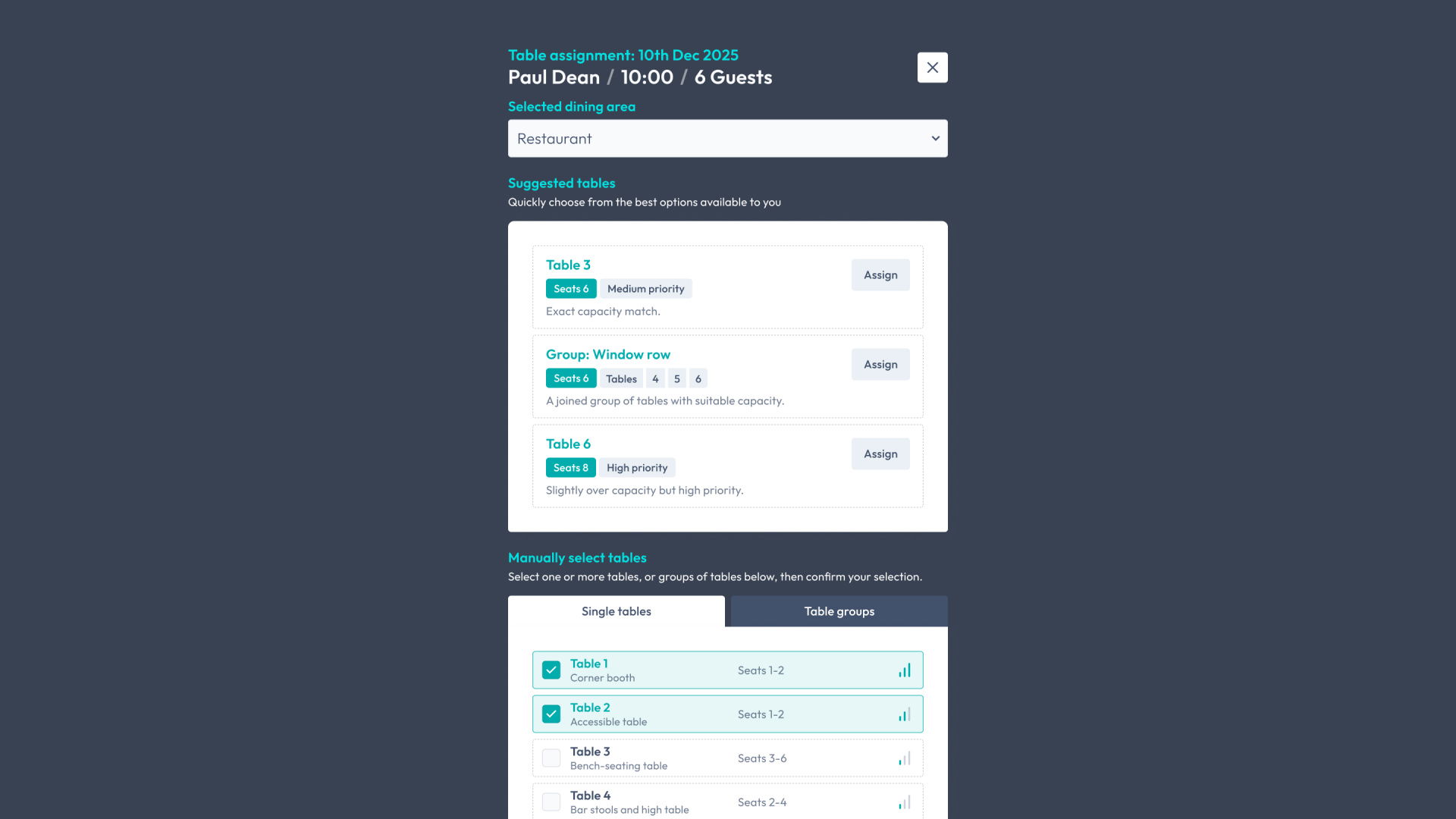 You will be able to assign a suggested table, or group of tables, to a booking with a single click.