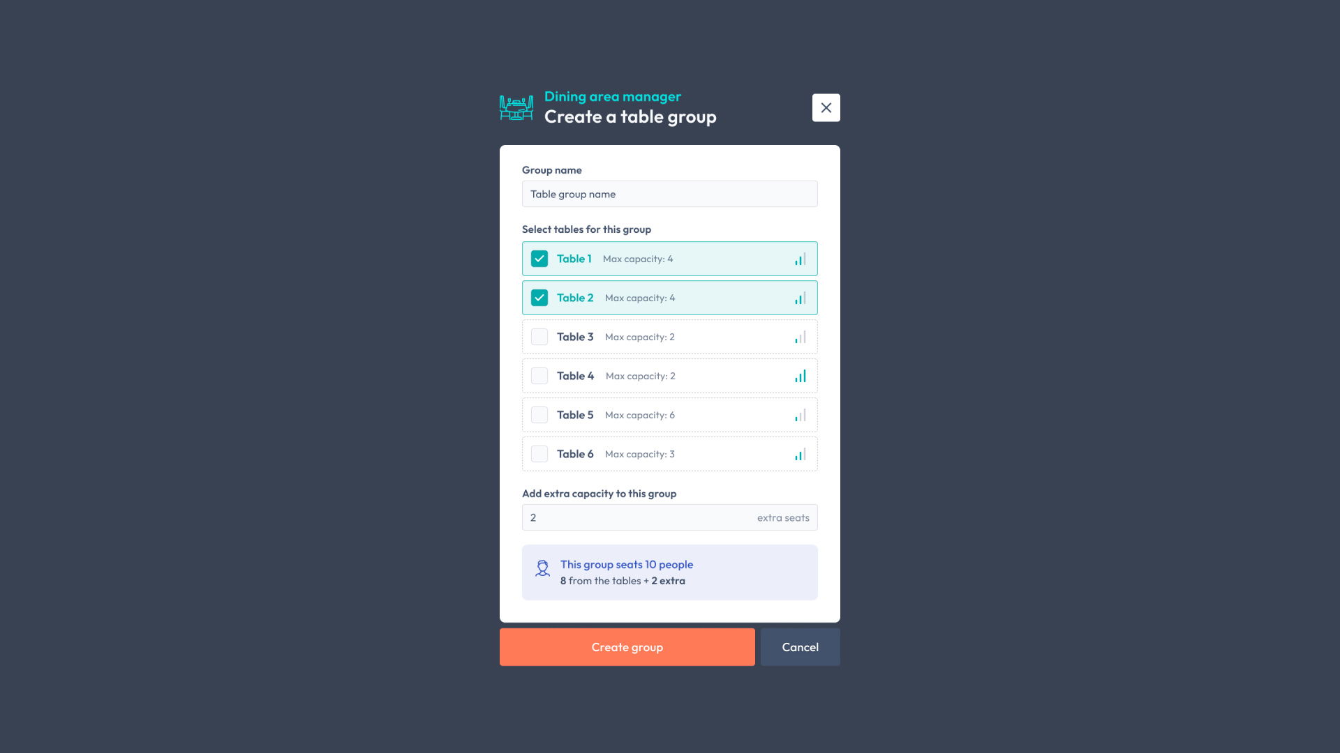 In the next update, we're introducing the ability to create table groups by joining tables together. Many restaurants already do this operationally, so bringing it into Easy Eatery makes planning more natural.
