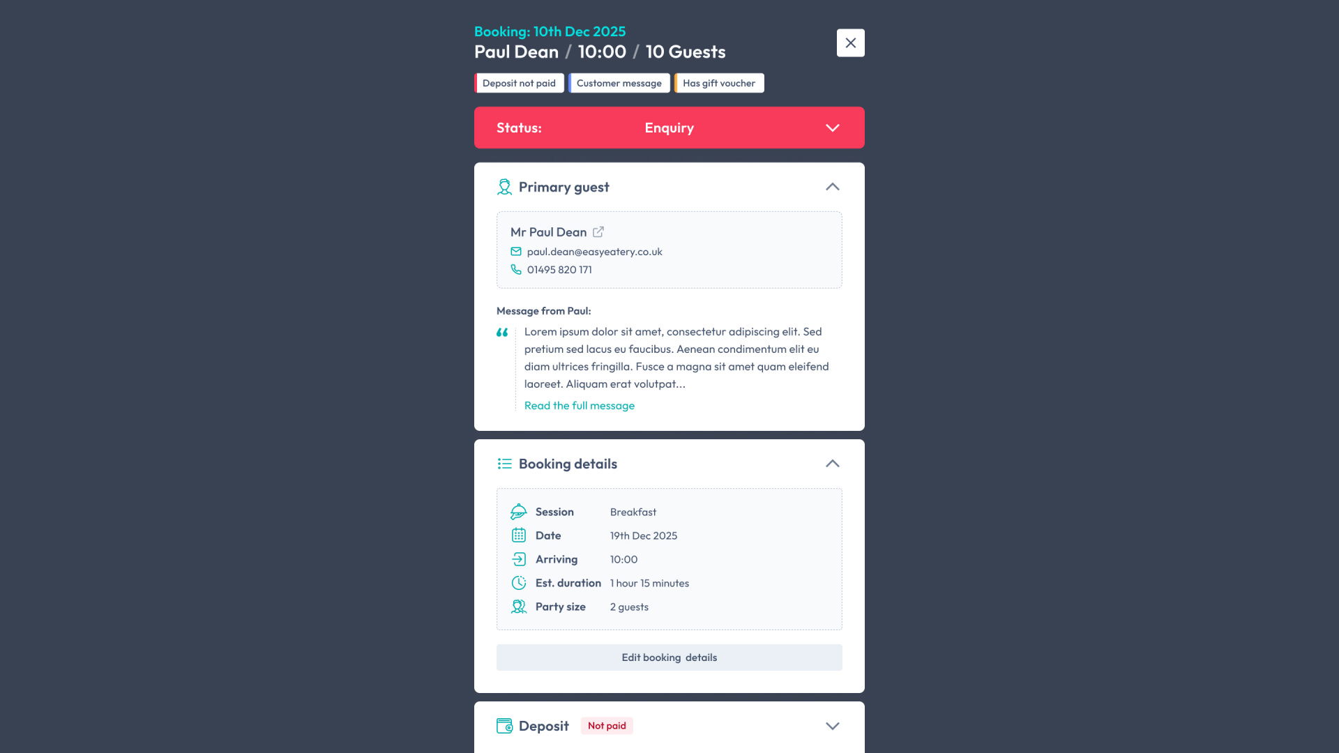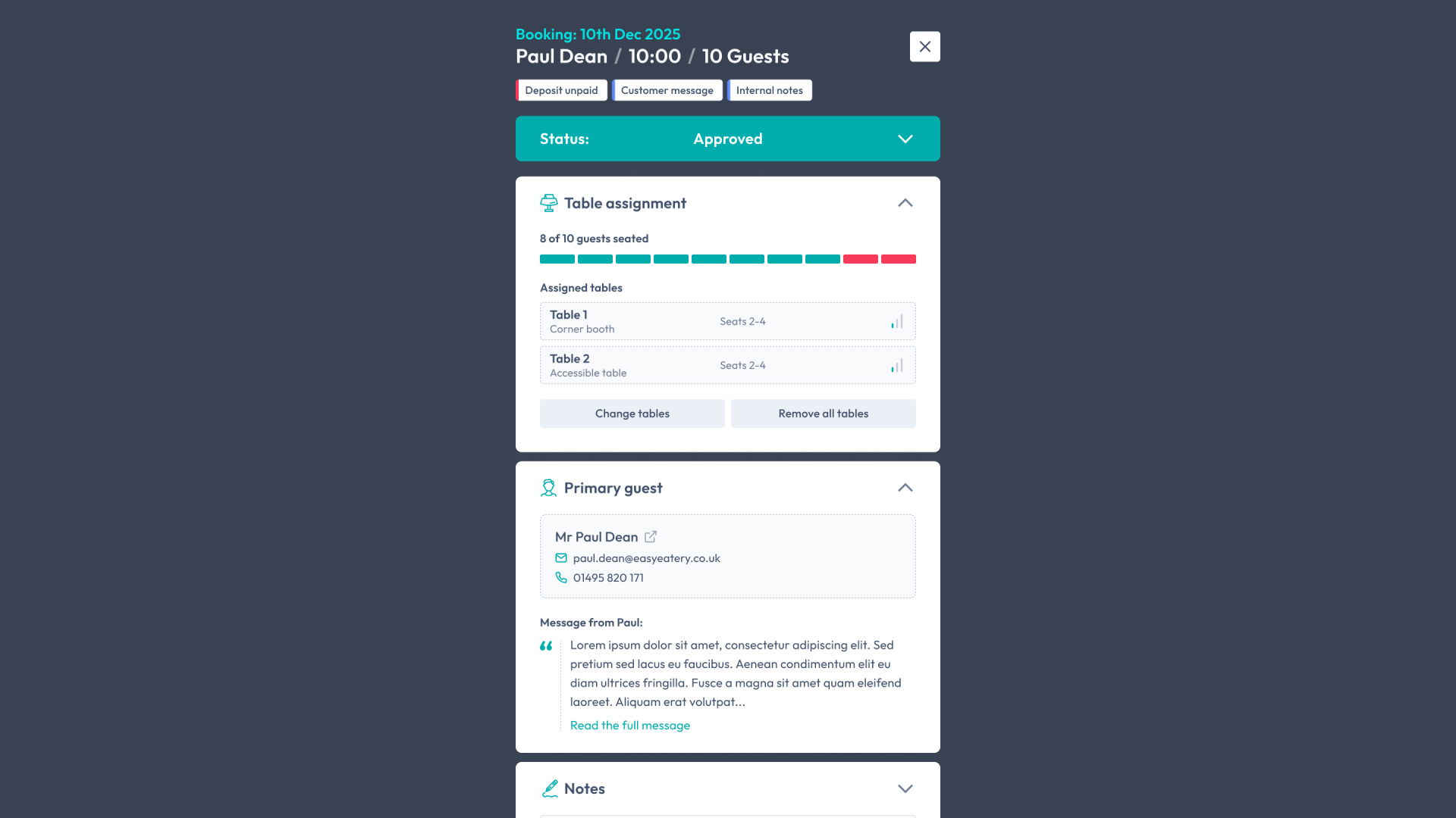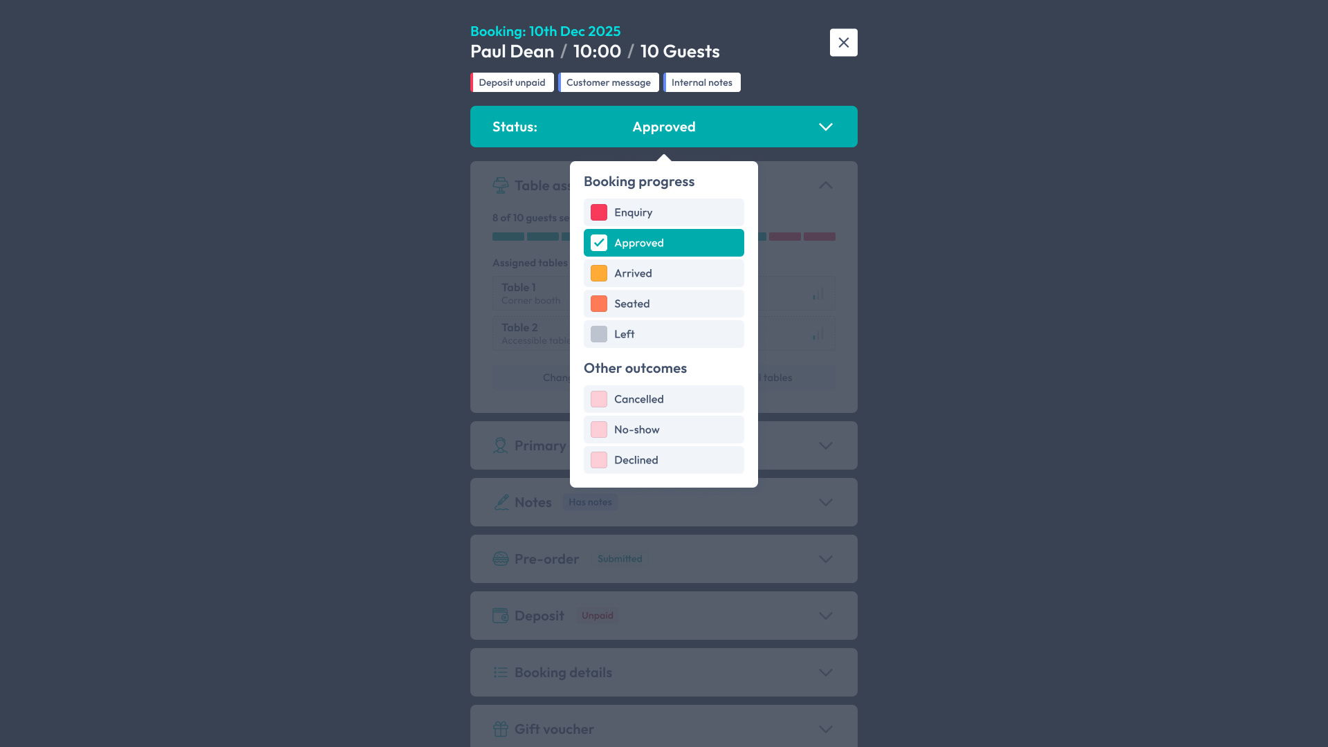 - Essential booking info (Booking date, arrival time, primary customer name and party size) remains visible at the very top.