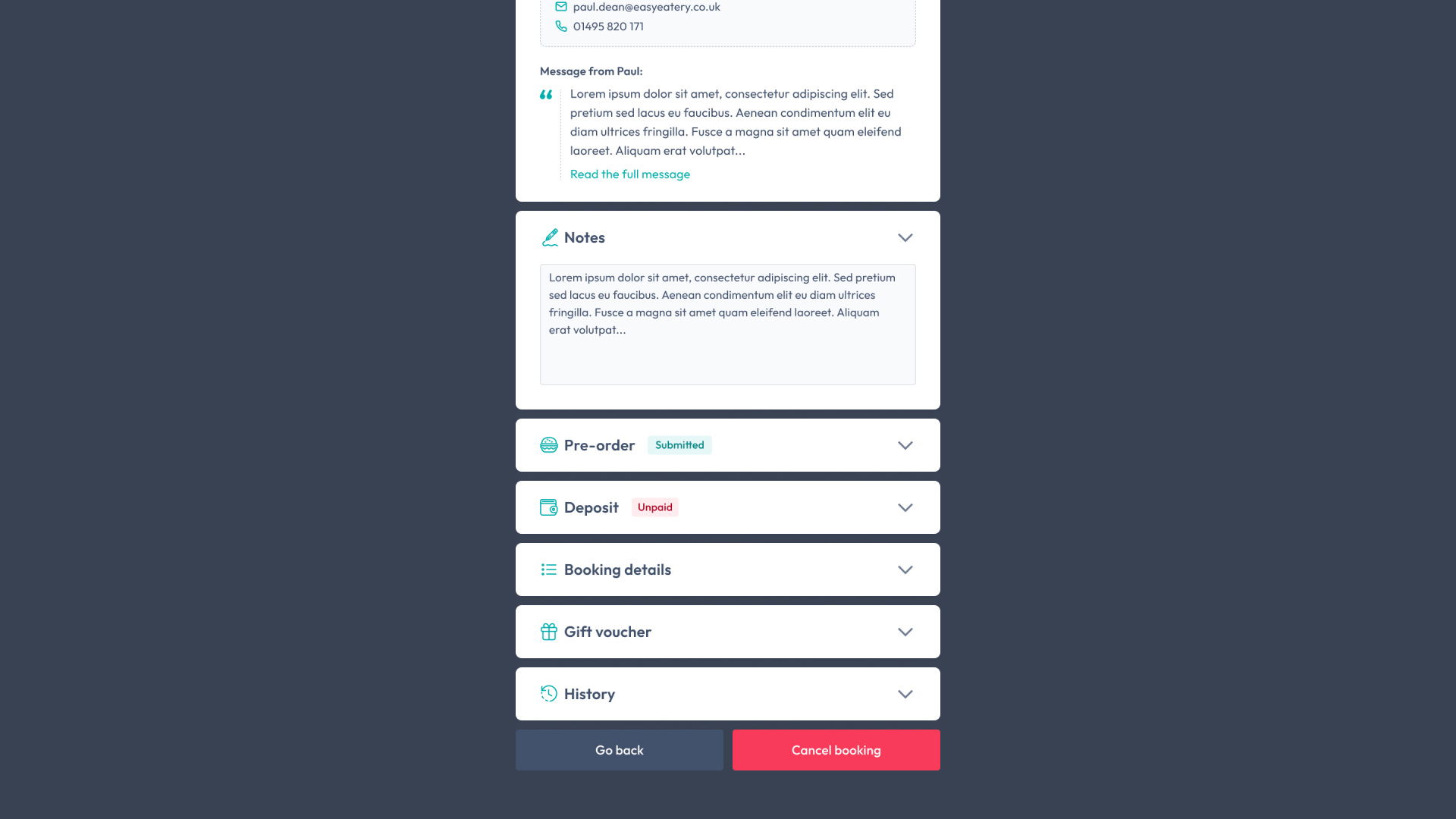We're adding subtle but helpful indicators in the headers of key sections to show critical information, even when a section is collapsed, like whether a pre-order is fully submitted, a deposit has been paid, or the booking has notes.