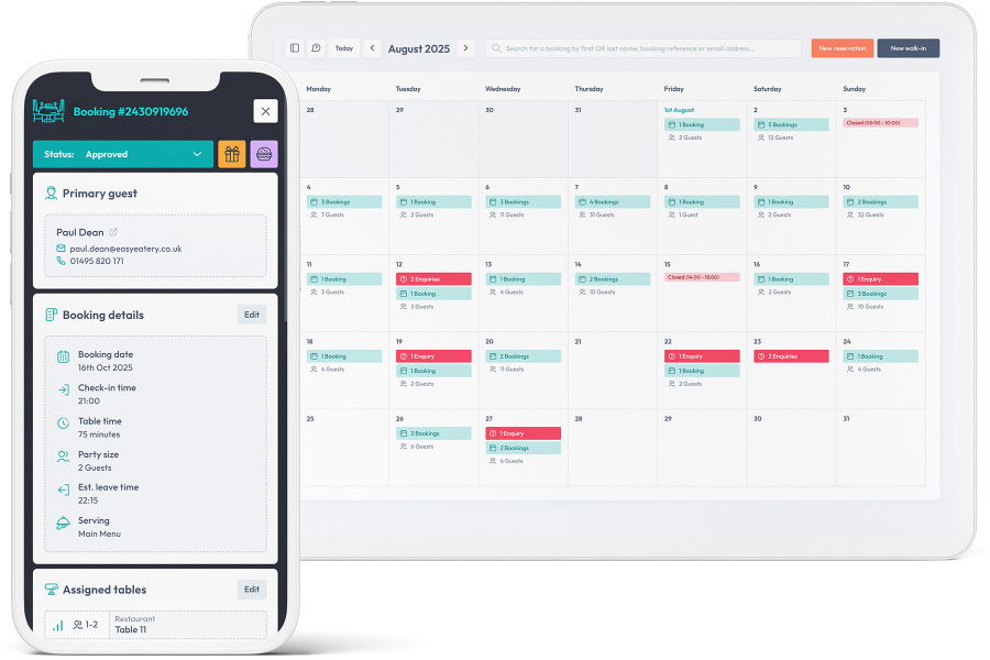 Keep your tables full and your guests happy with Easy Eatery. Our simple, powerful booking system saves you time, cuts admin, and helps reduce no-shows, so your restaurant runs smoothly every day.