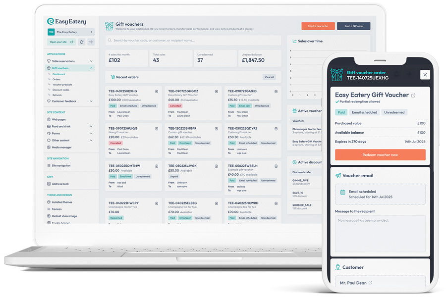 You don’t need to be a web designer to use Easy Eatery, our platform has been designed for everyone. With us you can easily keep your website up to date whilst keeping on top of table reservations, and voucher sales and more.